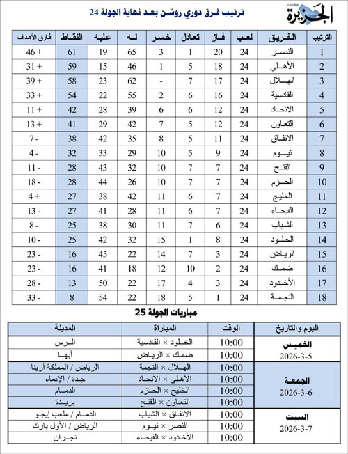 يعاود دوري روشن ركضه من جديد عندما تنطلق مساء اليوم الخميس مواجهات الجولة 25 بعدما تم تأجيل مواجهات أنديتنا المشاركة في النخبة الآسيوية ودوري أبطال آسيا، وستُلعب اليوم مواجهتان في افتتاح الجولة، ستكونان على النحو التالي: