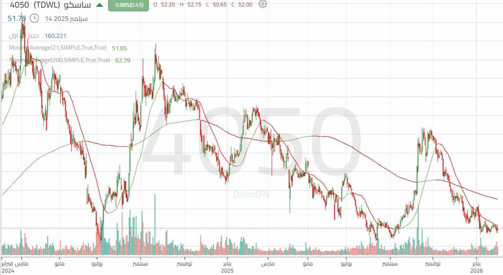 تحركات عرضية لسهم "ساسكو" داخل نموذج مثلث متماثل مع ترقب الاختراق